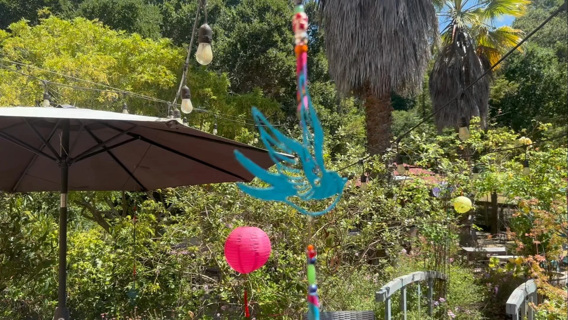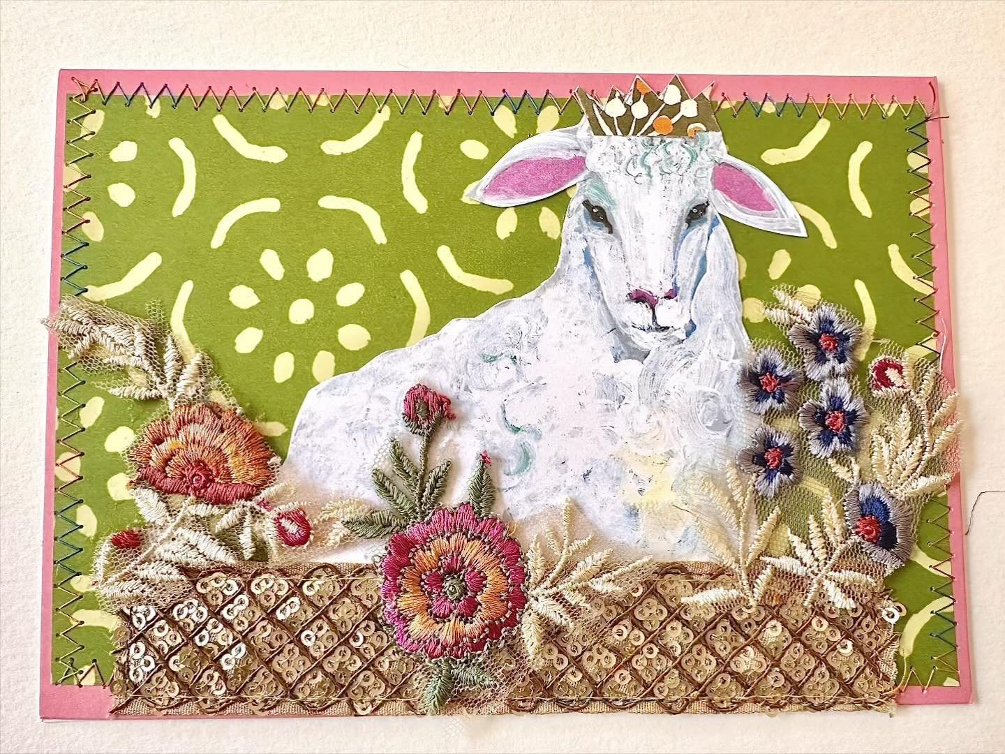 A woman created with recycled materials bringing the recipient inspiration through a personal gift word. Articulated figure made from recycled paintbrush, wood, paper, brads, paint, coffee filters, wire, and beads.
